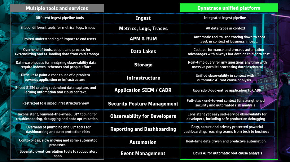 Günümüzün optimizasyon ve verimlilik ihtiyacı, yöneticileri alternatif kurulumlar ve mimariler aramaya itiyor ve bu da onları genellikle tüm bu ihtiyaçları aynı anda karşılayabilen birleşik bir platform olarak Dynatrace'e yönlendiriyor.