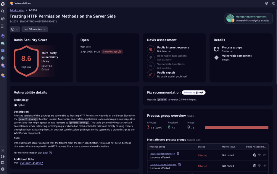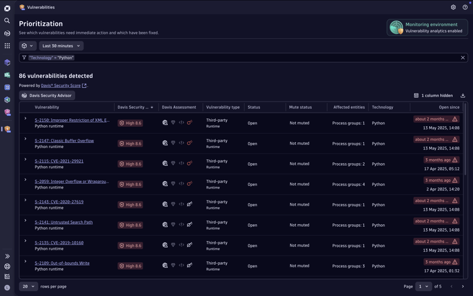 Dynatrace Çalışma Zamanı Güvenlik Açığı Analizi, artık Dynatrace tarafından izlenen uygulamalardaki savunmasız Python kütüphanelerini ve Python çalışma zamanı güvenlik açıklarını tespit ediyor.