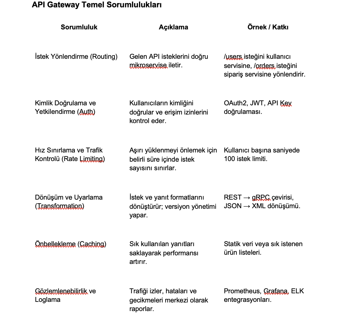Bu yapı yalnızca istek yönlendirmekle kalmaz; kimlik doğrulama, yetkilendirme, hız sınırlama (rate limiting), caching, loglama ve hata yönetimi gibi birçok kritik işlevi merkezi olarak üstlenir. Böylece her mikroservisin bu özellikleri ayrı ayrı uygulamasına gerek kalmaz. Bu da sistemin hem güvenliğini hem de yönetilebilirliğini artırır.