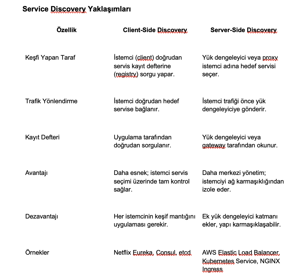 Service Discovery iki temel yaklaşımla uygulanır: client-side discovery ve server-side discovery. Client-side modelde istemci hangi sunucuya gideceğini kendi belirler (örneğin Netflix Eureka). Server-side modelde ise yük dengeleyici (örneğin AWS ELB veya Kubernetes Service) bu kararı verir. Her iki yaklaşım da yüksek ölçeklenebilirlik ve esnek trafik yönlendirmesi sağlar.