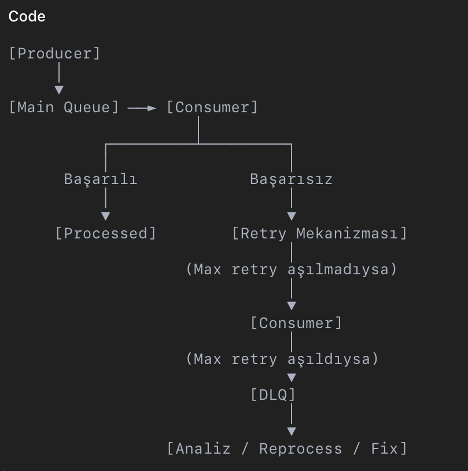 Bu akışta bir mesaj önce ana kuyruğa (Main Queue) gelir ve tüketici tarafından işlenir. Eğer işlem başarılıysa süreç tamamlanır. Ancak hata oluşursa mesaj belirli sayıda yeniden denenir (retry mekanizması). Eğer bu denemeler de başarısız olursa, mesaj DLQ’ya aktarılır.